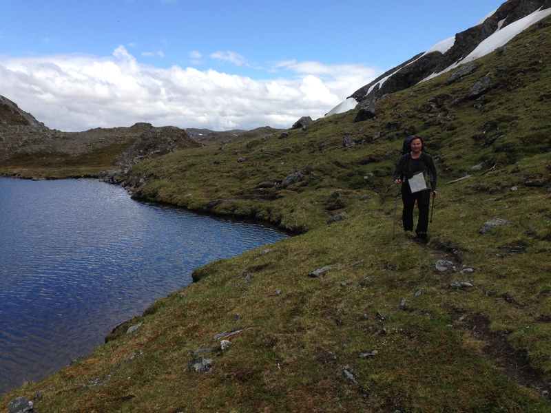 Søndag våknet vi til overskyet, men fint vær. Til frokost ble det to steikepanner med nydelig fisk, før hytta ble ryddet og vi var klare til retur til bilen. Vi valgte øvre rute over fjellet hjem og i godt vær var dette en flott rute. Vi stoppet og nøyt usikten og koste oss i sola som kom mer og mer fram fra skyene. Siste stopp før nedklatring fra fjellet var rundvannet nord for Čeabetjàvri. Det ble en liten fisk, men ellers ville de ikke bite. Siste etappe var nedstigning til dalen og vandring nordover til bilen. Skyene var da forsvunnet og vi hadde et nydelig vær.Selv en ikkefiskende turgåer hadde en fin tur.