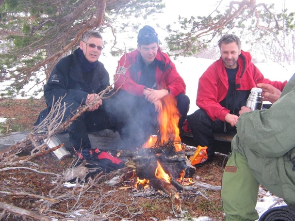 Turen gikk så videre inn over dalsiden. Tre av gutta stoppet under veis på et vann hvor de ville prøve fiskelykken (dette er ikke vanlig på våre turer). De øvrige fortsatt videre. Været ble etter hver ikke det aller beste, mildværet med noe regn og sludd som det også var meldt, begynte å gjøre seg gjeldende. Etter å ha gått et stykke innover dalsiden, bestemte vi oss for å trekke oss ned i skogen hvor vi fant ei stor furu som vi kunne sitte under. Her ble det skikkelig koselig med stort bål. Vi ble sittende ut på ettermiddagen. Vi storkoset oss under furua som skjermet for været. Gutta som ble igjen for å fiske gikk direkte til stuene (var ikke med på bålkosen) med 2 små fisker. Denne lørdagen gikk vi ca 10 km.