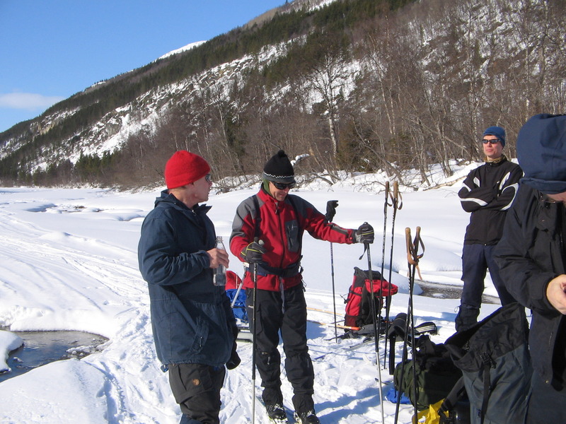 Etter en kort, uformell rådslagning (også dette en tradisjon i gjengen) ble det klarlagt at tanken om topptur måtte forlates til fordel for stø kurs mot Geatkevuopmi og en hytte der oppe. Vi krysset Spanijohka i sørvest på flatt område, og satte kurs noe mer vest.