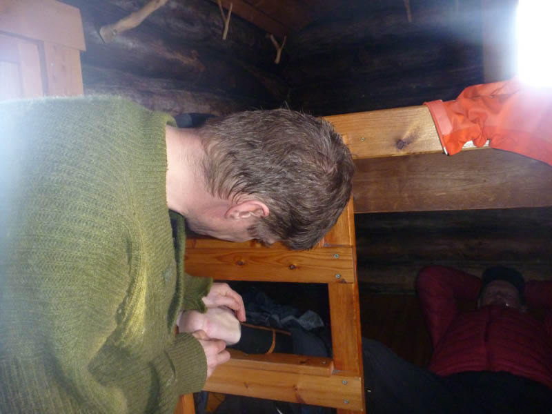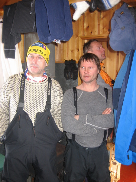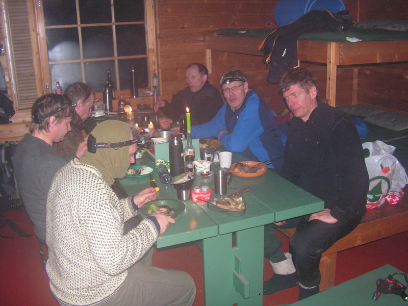 Etter hvert seg et mer alvorlig tema inn over oss. Magne kjente seg ikke i stand til å gå videre. Han mente selv at det ikke var noe problem å returnere alene, men selv om været var veldig bra var alle vi andre enige om at det ikke var noe godt alternativ. Løsningen ble til slutt at han skulle holde følge med et tsjekkisk par som bodde i den andre halvdelen av hytta.