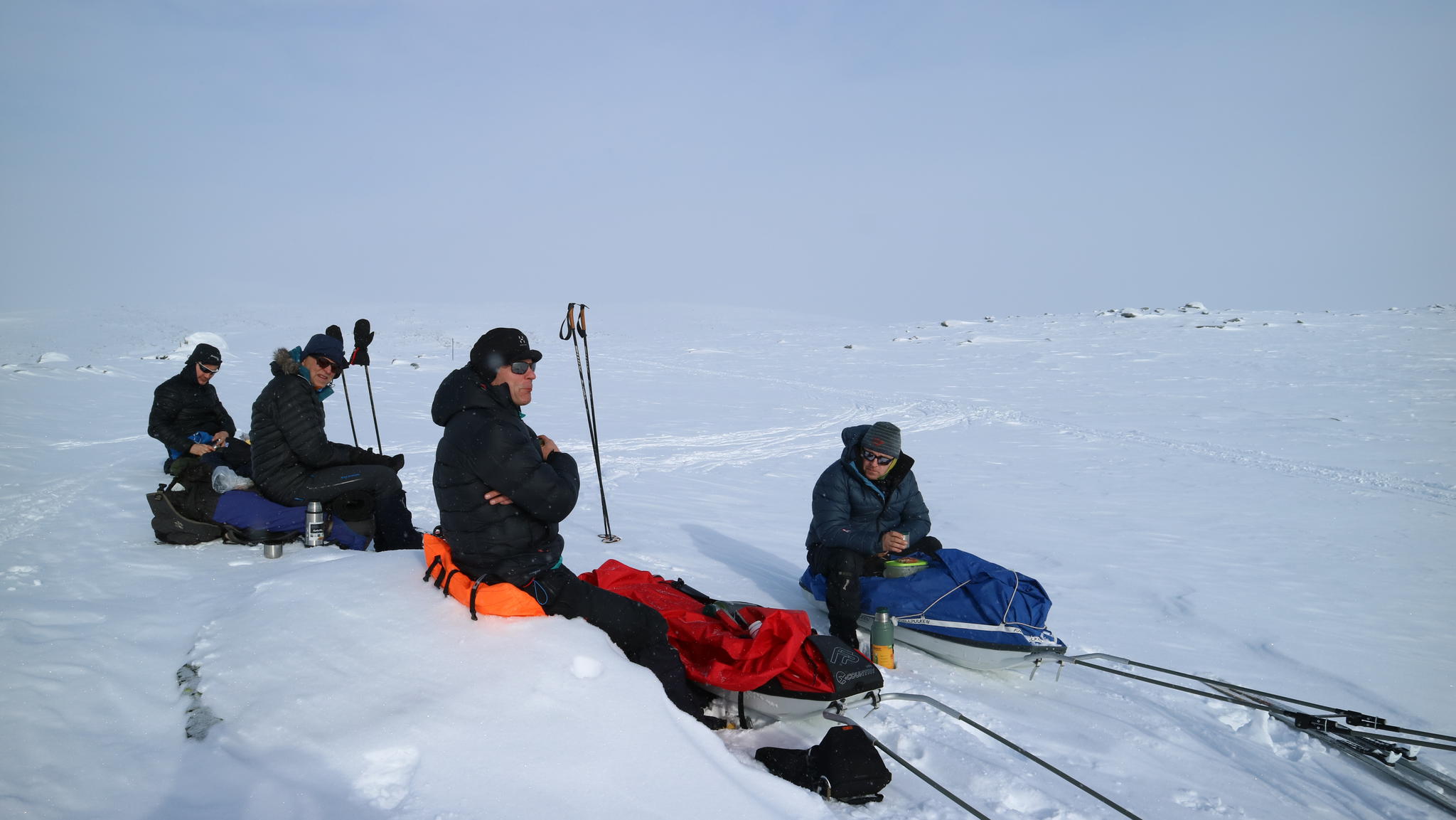Søndag gikk vi radig videre. Mer sol, flere lange slake nedkjøringer og vinden i ryggen gjorde dagen grei. Resten av maten ble fortært i løpet av en god lunsj i Saarijarvi hytta. På veien videre mot Kilpisjarvi møtte vi mange med store pulker godt rustet for lang påske på vidda.