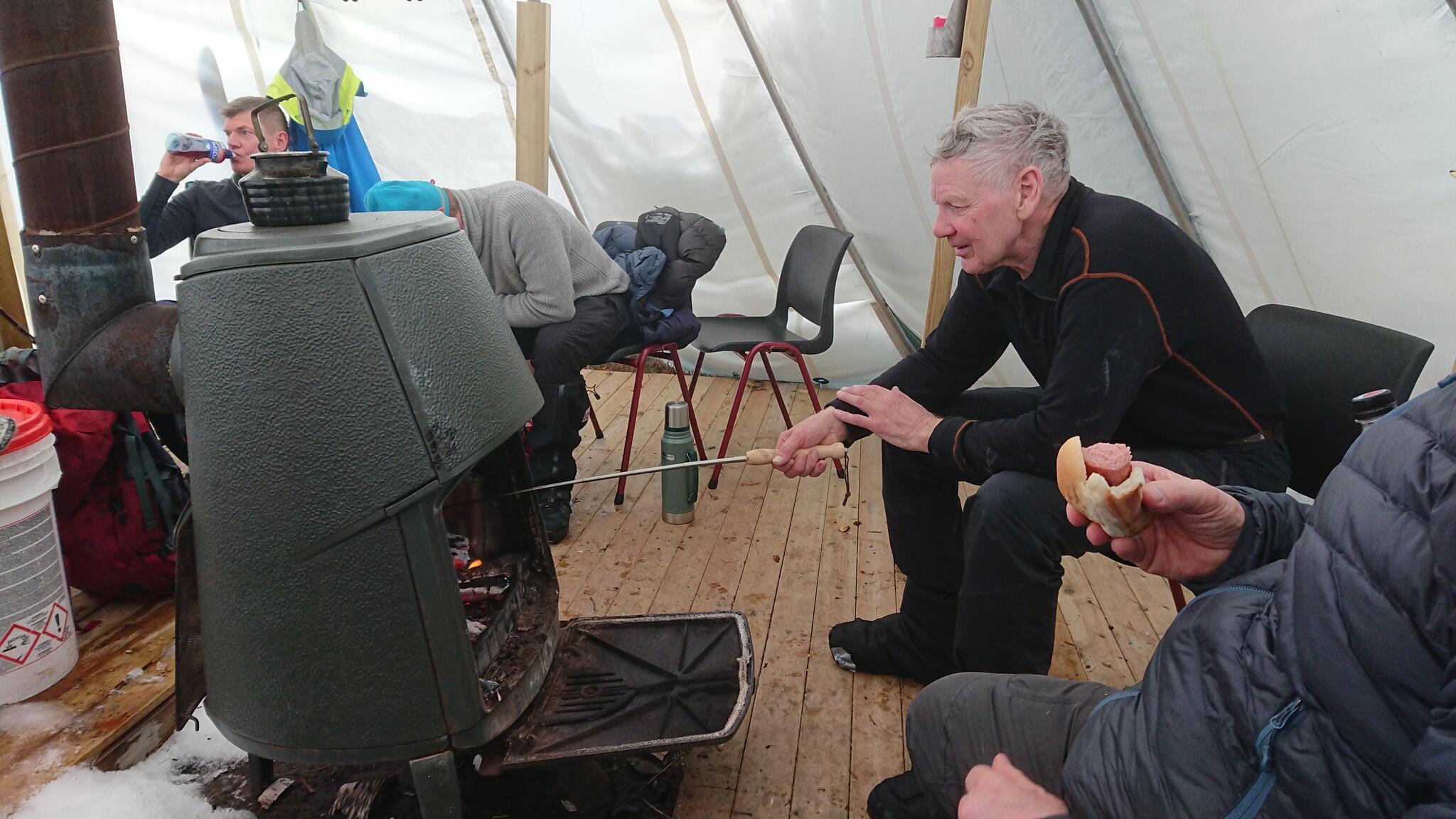 Turen gikk så videre oppover dalen forbi Gauknesbu før vi snudde og gikk tilbake til lavvoen. Der fyrte vi opp i ovnen og stekte pølser.